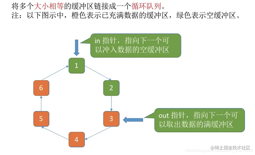 注意:当缓冲区数据非空时,不能往缓冲区冲入数据,只能从缓冲区把数据传出;当缓冲区为空时,可以往缓冲区冲入数据,但必须把缓冲区充满以后,才能从缓冲区把数据传出。