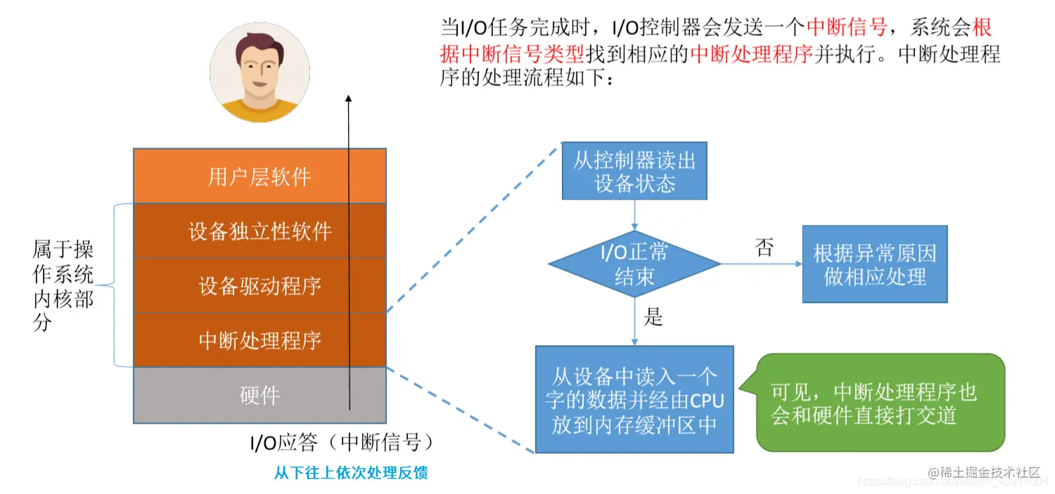 - 完成一次读/写操作的流程(见右图,Key word:中断)