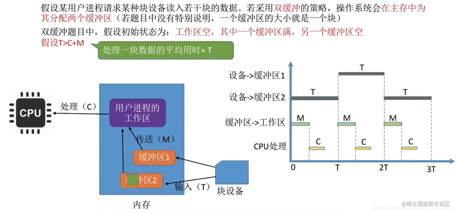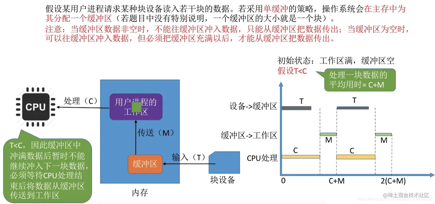 假设某用户进程请求某种块设备读入若干块的数据。若采用单缓冲的策略,操作系统会在主存中为其分配一个缓冲区(若题目中没有特别说明,一个缓冲区的大小就是一个块)