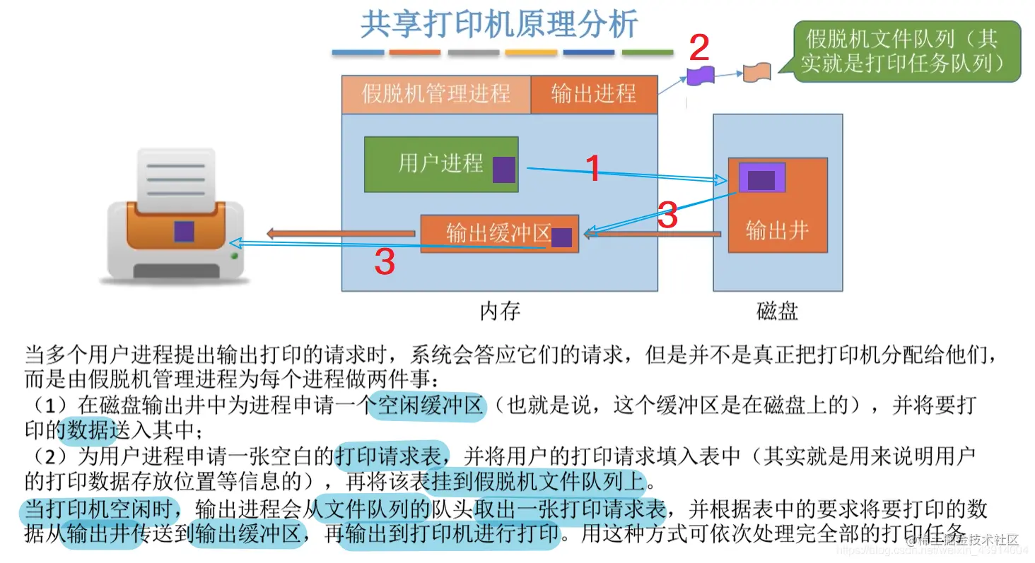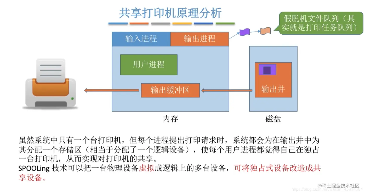 虽然系统中只有一个台打印机,但每个进程提出打印请求时,系统都会为在输出井中为其分配一个存储区(相当于分配了一个逻辑设备),使每个用户进程都觉得自己在独占一台打印机,从而实现对打印机的共享。