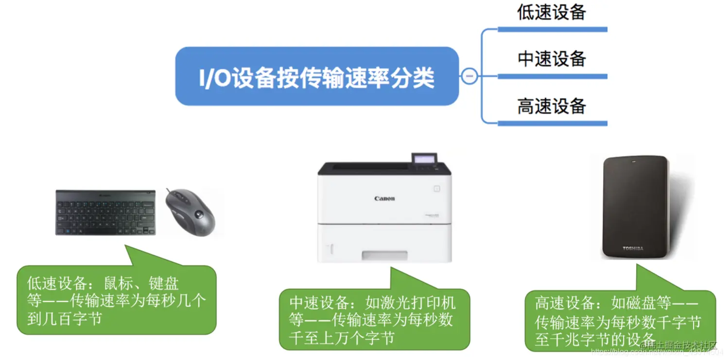 高速设备:如磁盘等——传输速率为每秒数千字节至千兆字节