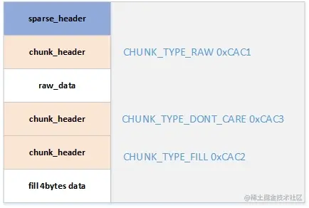 稀疏镜像数据格式:首先是sparse_header占用28byte,然后是12byte的chunk_header,同样这chunk_header的类型决定了后面跟着的数据,如果读到数据是0xCAC1意味着后面是本身的raw_data,如果是0xCAC3,则后面num为0,接着再0xCAC2意味着后面填充4byte的内容。