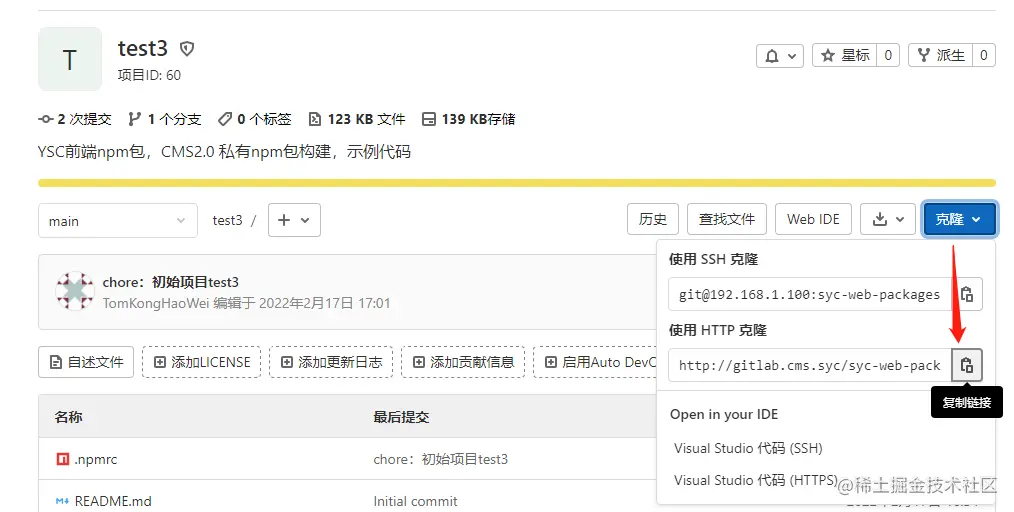 输入以下内容: @syc-web-packages:registry=gitlab.cms.syc/api/v4/pack…