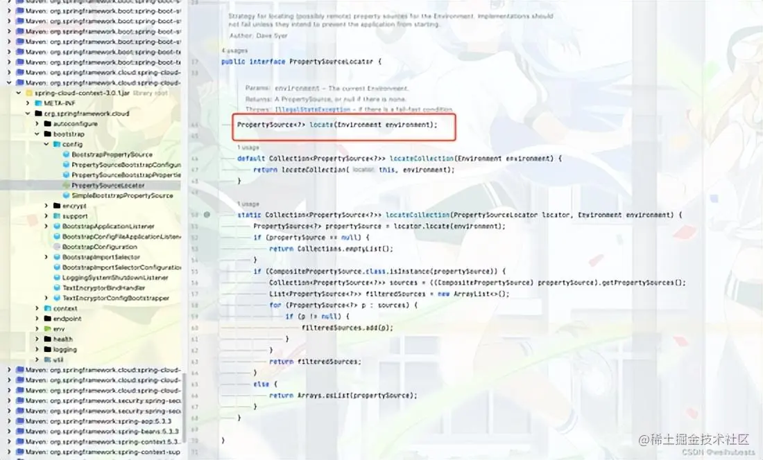 而Spring Cloud刚好提供类这方面的扩展,Spring Cloud 提供了 PropertySourceLocator 接口供我们加载自定义配置成 PropertySource