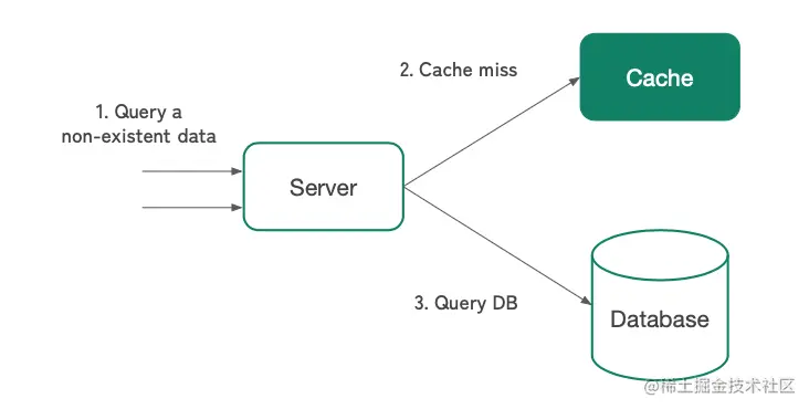 key并返回空结果,因此该key也不会被缓存。 - 因此,每个查询最终都会导致缓存未命中,而命中数据库,直接进行查库。