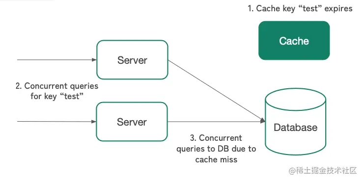 当缓存键过期时会发生缓存故障,并且多个请求同时访问数据库以查找相同的键。
