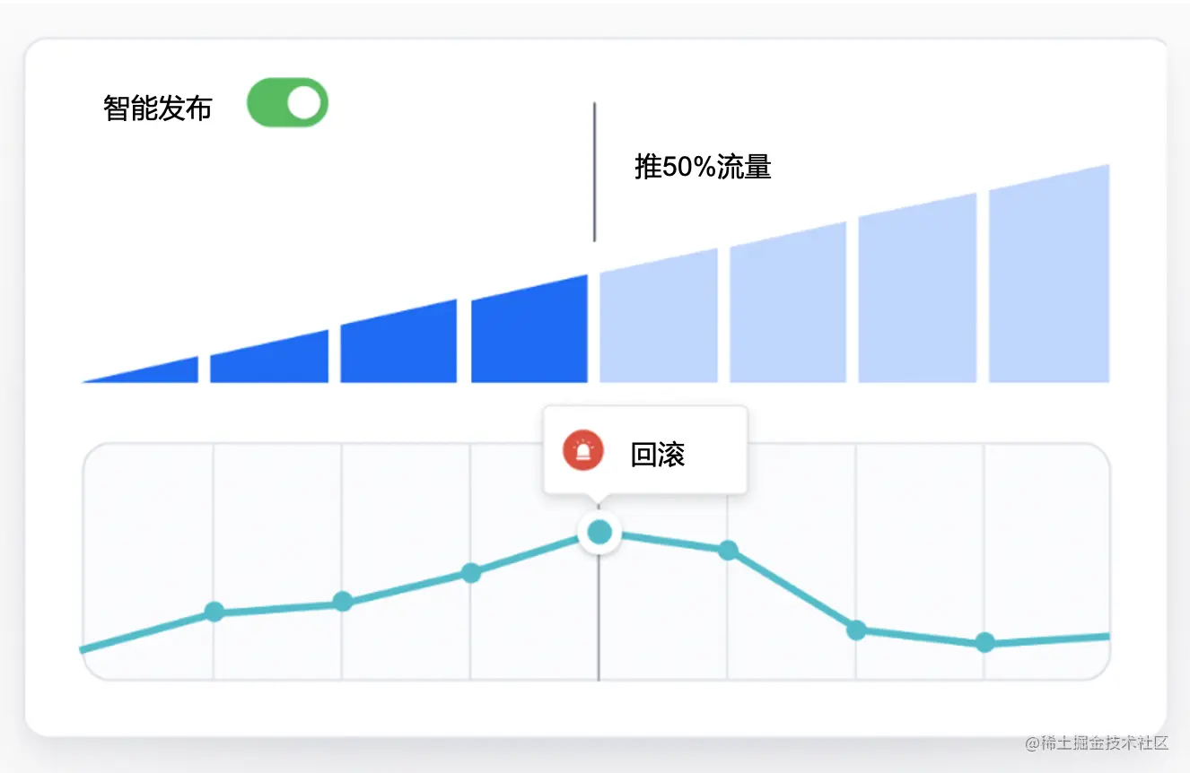 针对上述痛点,火山引擎A/B测试(DataTester)推出“智能发布”功能,可以大幅降低企业在A/B实验时的人力成本,并且新功能发版时的自助式灰度扩量,可以显著缓解每一次上线发布的风险,有了智能灰度、快速回滚等功能的多重保障,让企业的产品新功能的上线风险不断降低。