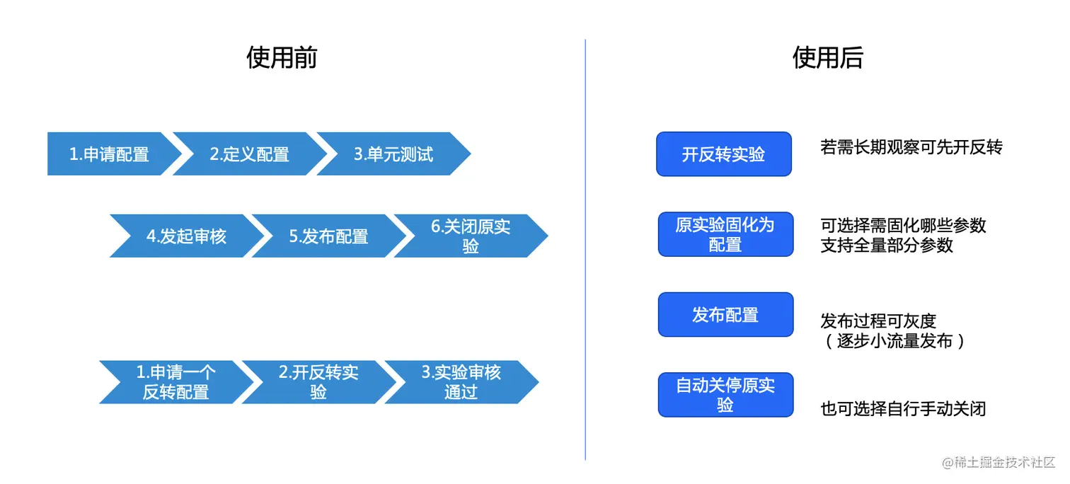 常规的A/B测试平台,在设计配置A/B实验时,均需要产品、研发、运维通力合作才能实现,时间成本和人力成本较高,同时上线功能出现问题后回滚处理的时间也较长。这种高成本和风险的不确定性,让很多企业对于A/B实验在自己业务中的广泛应用望而却步。
