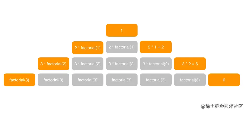 由上图可以看出,整个递归的过程和栈的入栈出栈的操作非常类似:橘黄色背景的圆角矩形代表了栈顶元素,也就是正在执行的操作,而灰色背景的圆角矩形则代表了其余的元素,它们的顺序就是当初被调用的顺序,而且在内容上保持了当时被调用时执行的代码。