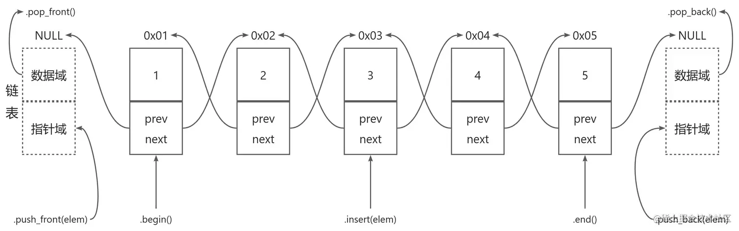 .push_back(elem);//尾插.push_front(elem);//头插.pop_back();//尾删.pop_front();//头删