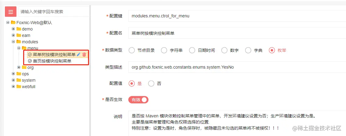 通过本节,可以了解到 Foxnic-Web 的模块是可插拔的,而且通过参数控制,菜单也可随已插入的模块动态发生改变。