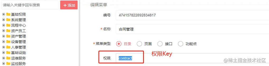 以上代码在 getAuthorities 方法中返回一个数组,这个数组包含当前模块所涉及的菜单的最顶层菜单的权限Key,权限Key在菜单管理定义,如图所示: