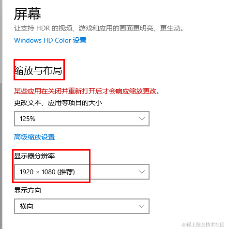 其实他还设置了缩放125%,所以真实分辨率是1920/125% 1080/125%,即1536*864。具体如下图