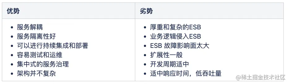 听起来这种方式比之前的单体架构厉害了不少,但还是会有一些对应的问题,比如每一个拆分之后的服务“依然还是单体服务”,有一些每个模块中都会使用的公共模块没有拆分(这也会导致 ESB 比较复杂)。 总结来说,面向服务架构有这些优劣势: