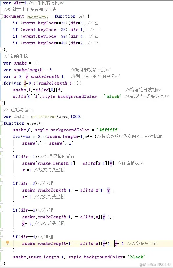 用一个数组装三个td作为蛇身。通过更换蛇头那个td来使蛇身前进并控制蛇头的转弯,每走一次顺次将蛇身数组前面的值往后挪一位,挤掉蛇身数组的最后一个td。