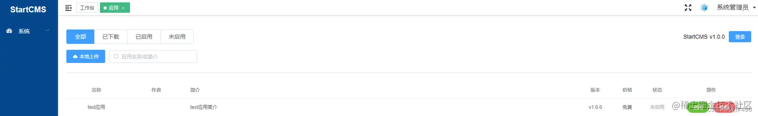 到这一步,后端工作基本准备完成。点击启用安装应用。安装成功后刷新页面