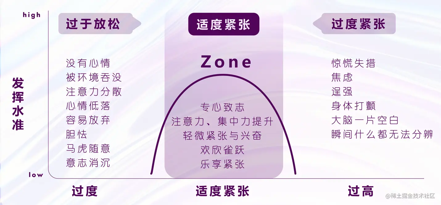 其实在 1908 年,耶克斯和多德森博士提出一个倒 U 形假说(也叫耶克斯-多德森法则), 通过心理学证明:“与毫不紧张相比,适度紧张苦于实现更好的发挥。而压力过高或者过低,都会影响发挥。”