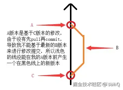 我commit后再pull而不能在本地合并的情况,结果导致我的commit直接把同事的修改覆盖了。因为相对于我此次的commit的A版本是同事的提交的B版本的上一个C版本,我直接是对C版本进行的修改,就是因为我没有先把同事的B版本先pull下来在本地产生一个最新的版本的合并。