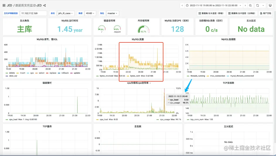 在某次大促的当天,突然接到 DBA 运维的报警,说数据库突然流量激增,CPU 也打到 100% 了,影响了部分线上功能和体验,遇到这种情况当时大部分人都比较紧张,下图为当时的数据库流量情况: