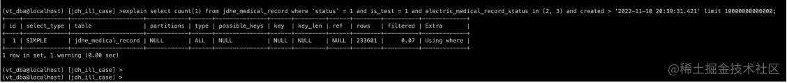 select count(1) from jdhe_medical_record where status = 1 and is_test = #{isTest,jdbcType=INTEGER} and electric_medical_record_status in (2,3) and patient_id = #{patientId,jdbcType=BIGINT} and doctor_pin = #{doctorPin,jdbcType=VARCHAR} and created >#{dateStart,jdbcType=TIMESTAMP};当时的索引情况