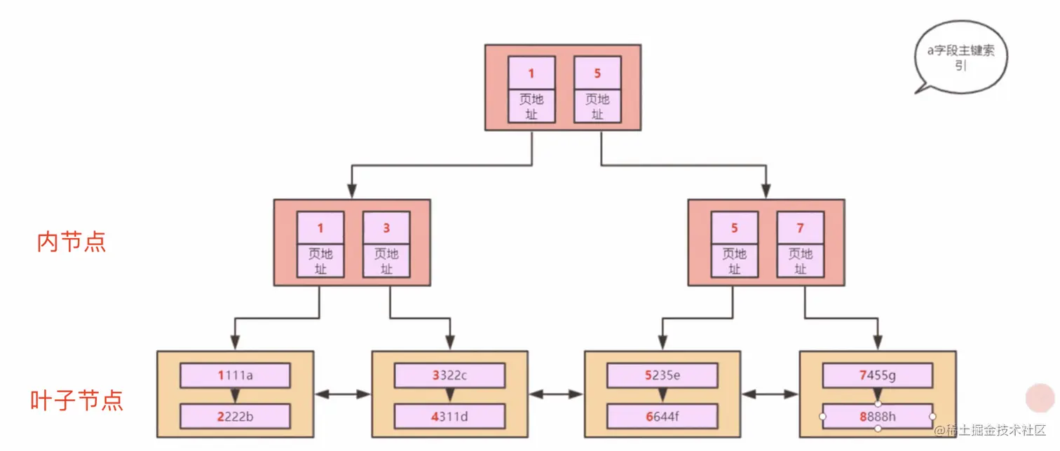 最下边的一层叫做叶子节点,上边的叫做内节点,而叶子节点中存储的是全量数据,这样的树就是聚簇索引。一直有同学的理解是说索引是单独一份而数据是一份,其实 MySQL 中有一个原则就是数据即索引、索引即数据,真实的数据本身就是存储在聚簇索引中的,所谓的回表就是回的聚簇索引。