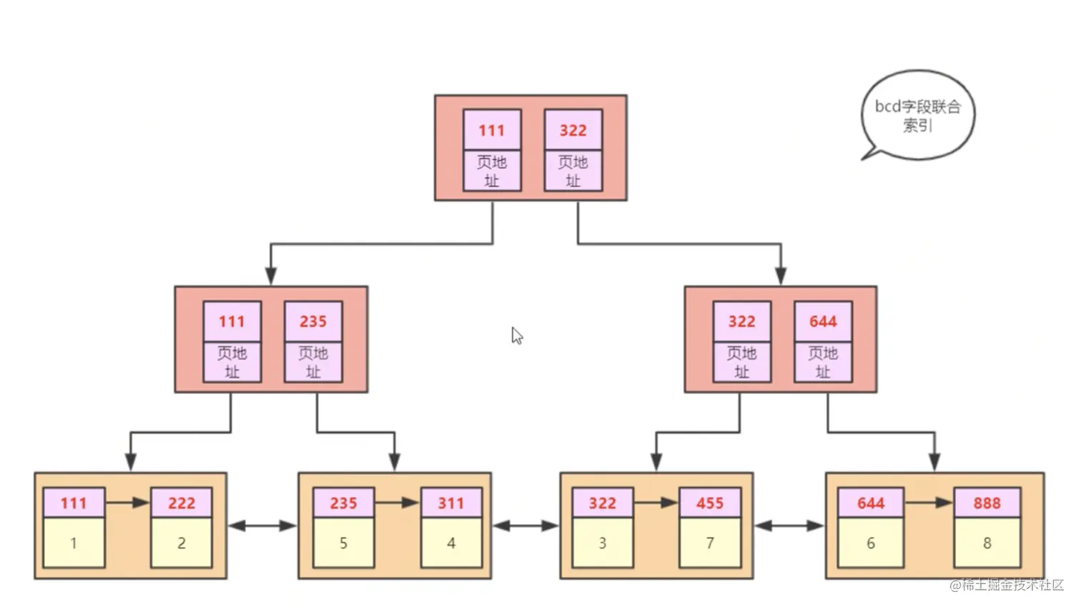 但是我们也不一定每次都按照主键来执行 SQL 语句,大部分情况下都是按照一些业务字段来,那就会形成别的索引树,例如,如果按照 b,c,d 来创建的索引就会长这样。
