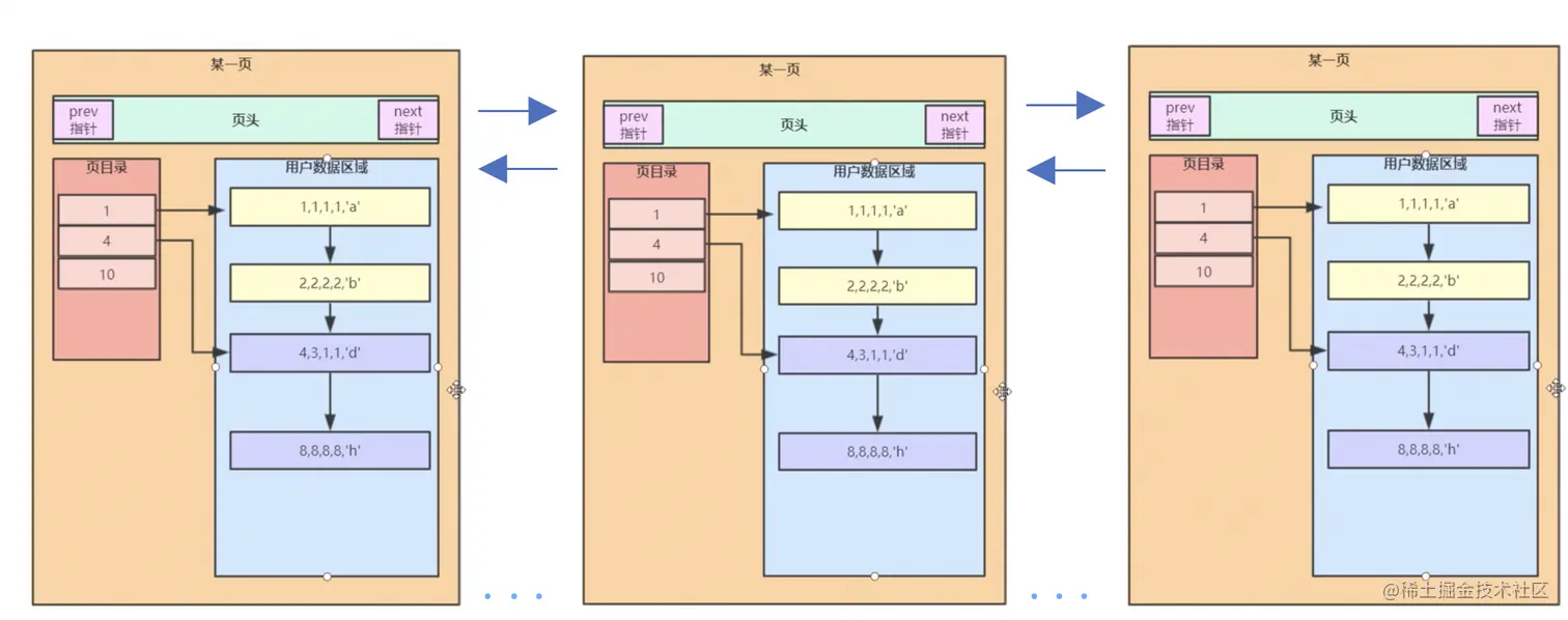 页内的单向链表是为了查找快捷,而页间的双向链表是为了在做范围查询的时候提效,下图为示意图,其中其二页和第三页是复制的第一页,并不真实。
