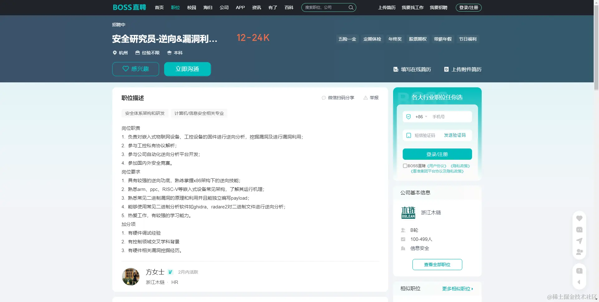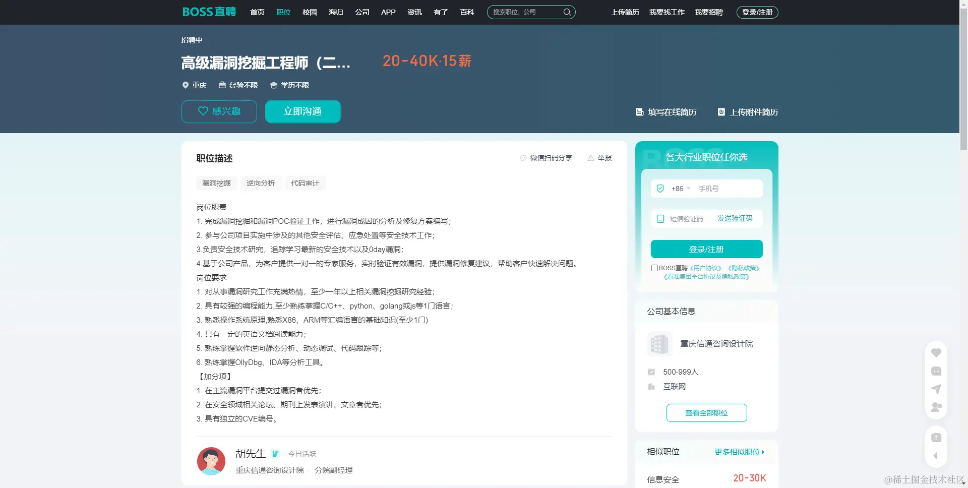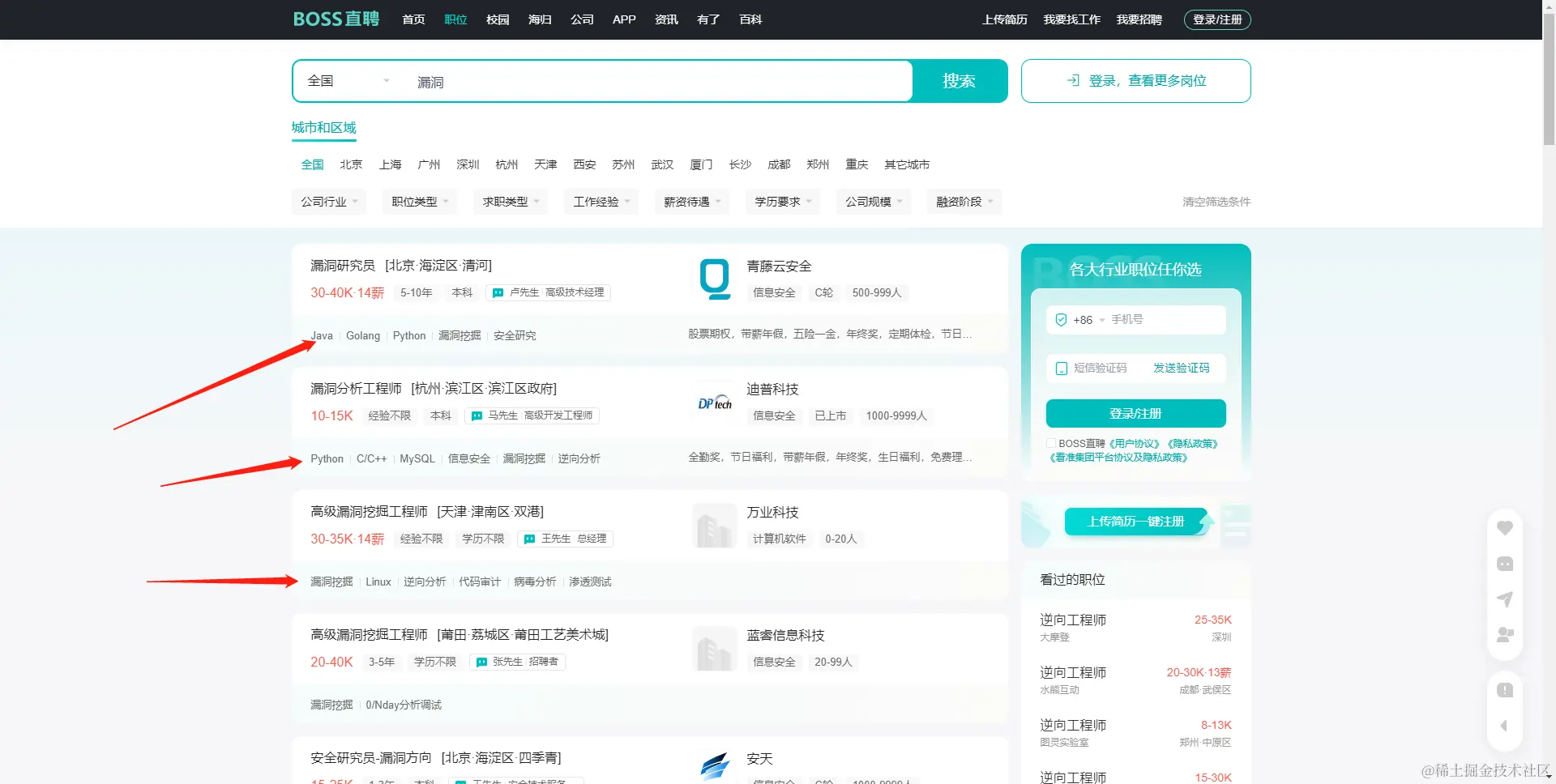 上篇文章我们初步了解了一下简历投递方式以及二进制方向相关逆向岗位的要求,今天我们就来看看二进制漏洞相关的岗位,当然,漏洞岗位除了分不同平台,也有漏洞挖掘岗和漏洞分析利用岗。同样,打开BOSS直聘官网,通过搜索漏洞关键字眼,查看相应岗位要求: