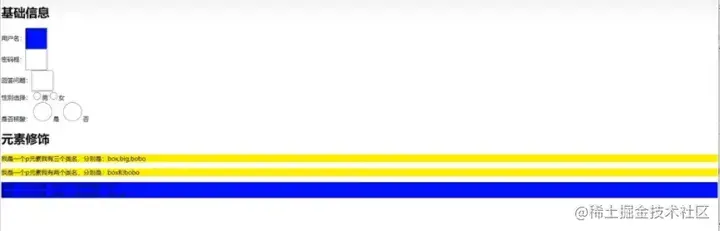 在body元素内部,添加准备好的基本结构,里面包含输入框,密码框,单选框以及带有类名的p元素和div元素。
