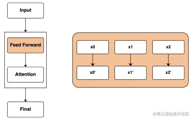 经过输入层后,我们到达了前馈网络层。在 Transformer 中,这一步可以对于序列的每一个元素独立的应用数学运算。
