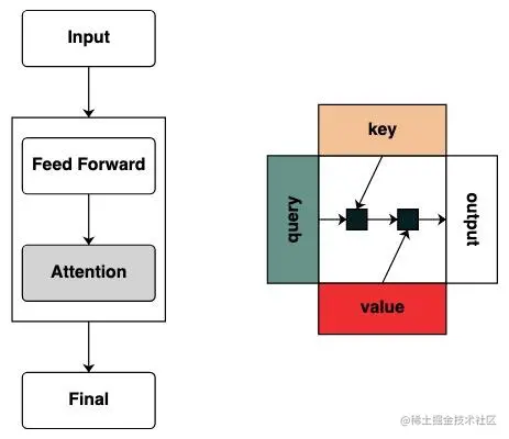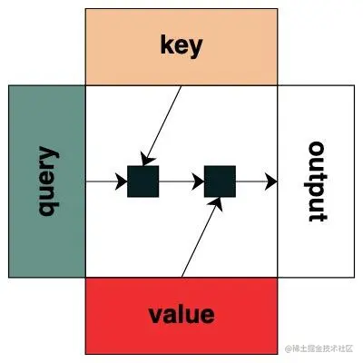 视觉上我们遵循图表结构,Query 在左边,Key 在上边,Value 在下面,输出在右边