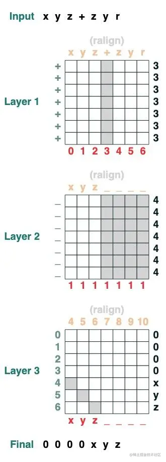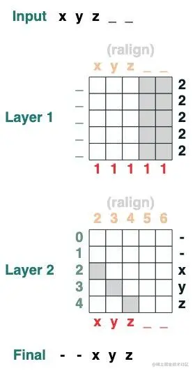 把一个序列在 token "v" 处分离成两部分然后右对齐 (2 层):
