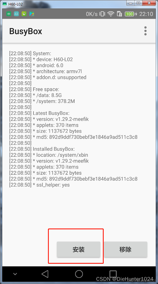 先安装 busybox 程序,打开软件,啥也不用动,点击安装,弹出root权限勾选允许