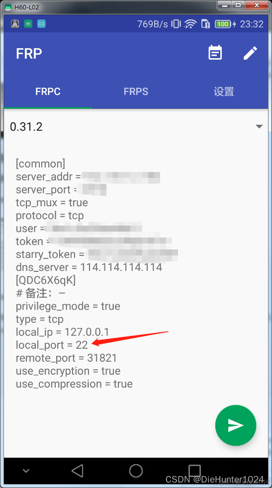 局域网能够成功连接后,我们就可以将服务部署到公网了,下载 frp安卓版,并安装到手机上,以 星空内网穿透 为例,复制config文件到Frp软件中,记得把端口填成ssh服务器的端口(默认 22)