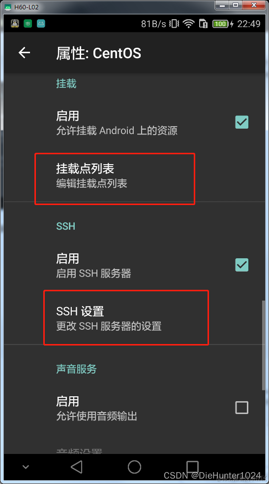 再看看ssh服务器,端口22,前面设置了用户名密码直接不用动ssh配置,开启就行
