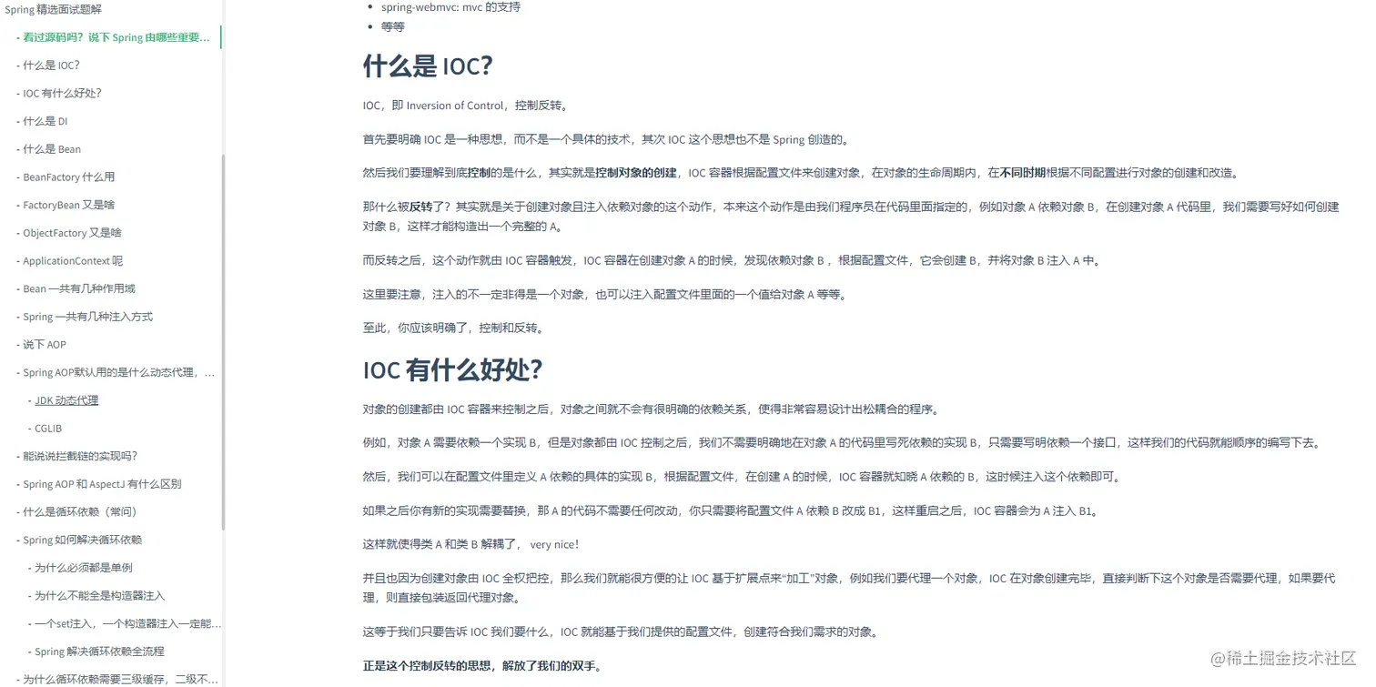 最后关于 Spring 的 IOC和 DI 概念的面试回答我之前也写过了,可以看下,网址是:https://yessimida.gitee.io/interview-of-legends/#/./docs/c-1Spring%E7%B2%BE%E9%80%89%E9%9D%A2%E8%AF%95%E9%A2%98%E8%A7%A3。