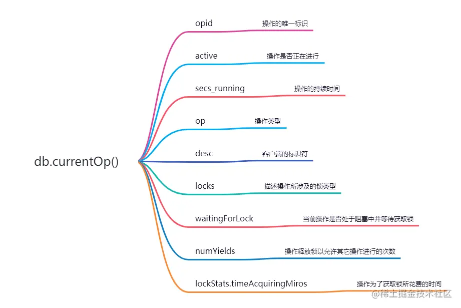 通过db.currentOp()查看当前操作,``db.currentOp()```最常见的用途是查找慢操作。