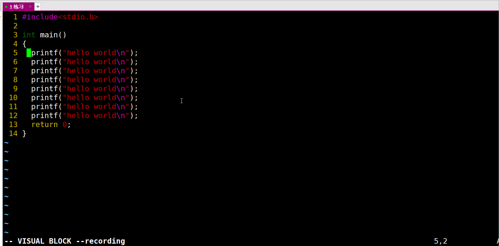 命令模式:vim默认打开就是命令模式,该模式是vim的最根本模式,几种模式的切换都是从命令模式进行的。( 其他模式进入命令模式的方法:无脑按Esc键即可 )。