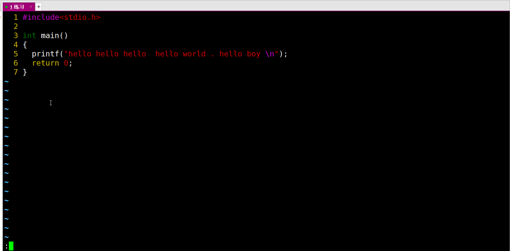 底行模式 :一种比较特殊的模式,在命令模式下按住****Shift: 即可进入底行模式,在底行模式下也有着对应的一些命令,包括vim的退出操作,也是在底行模式下进行,进入底行模式的标志是光标处在最底部,并且前面有一个冒号。如下: