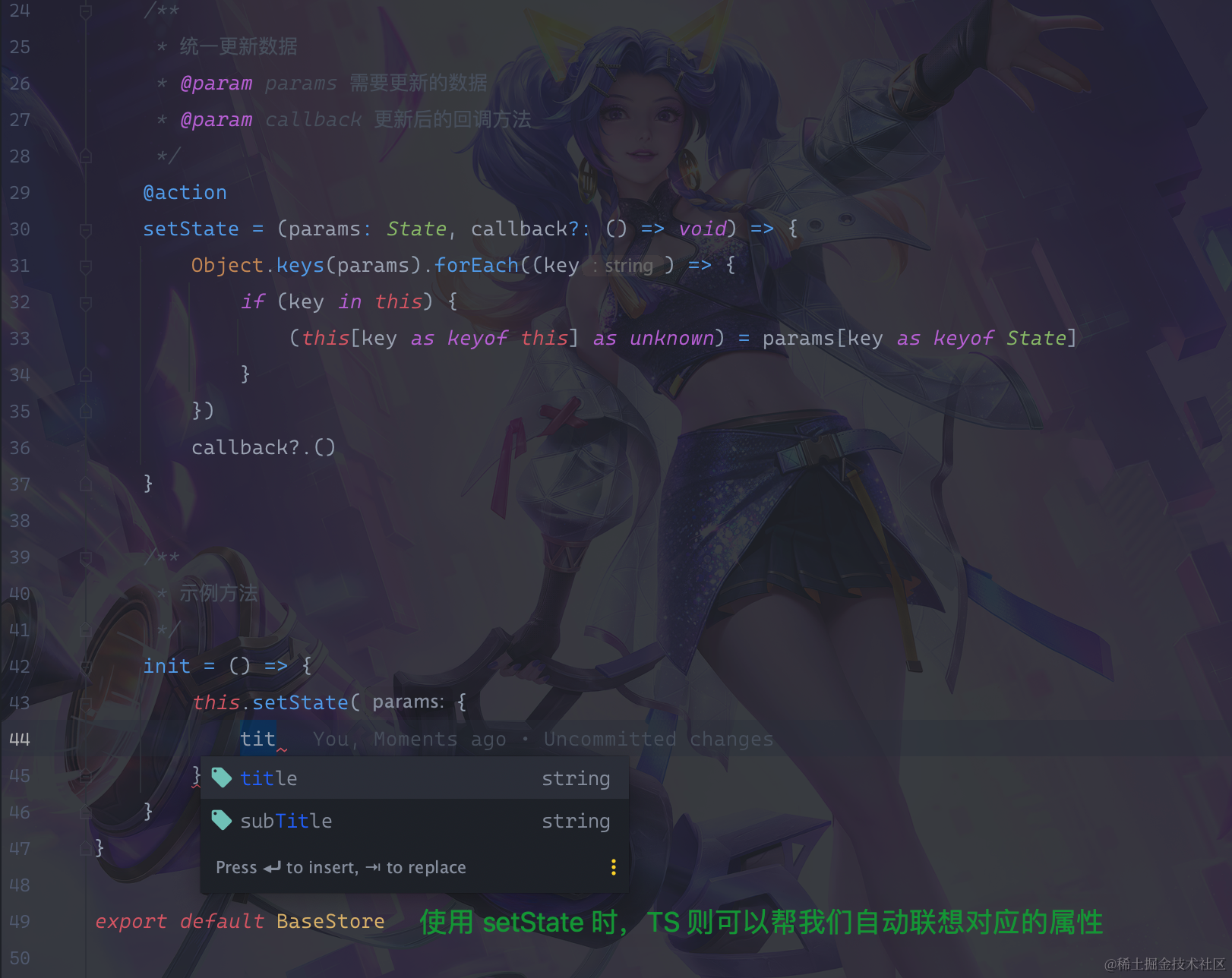 在 mobx 中,使用 @observable 定义的 state,修改时需要借助 @action 包装才能修改,在变量比较多的情况下,十分不便,这时可以封装一个类似 React 里的 setState 方法,统一修改,在结合 TypeScript 类型推导,可以实现代码联想功能。