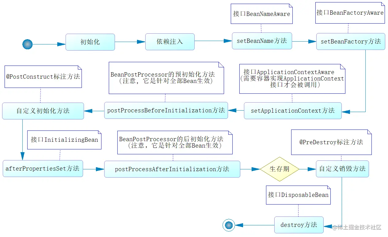 Spring容器管理Bean,涉及对Bean的创建、初始化、调用、销毁等一系列的流程,这个流程就是Bean的生命周期。整个流程参考下图: