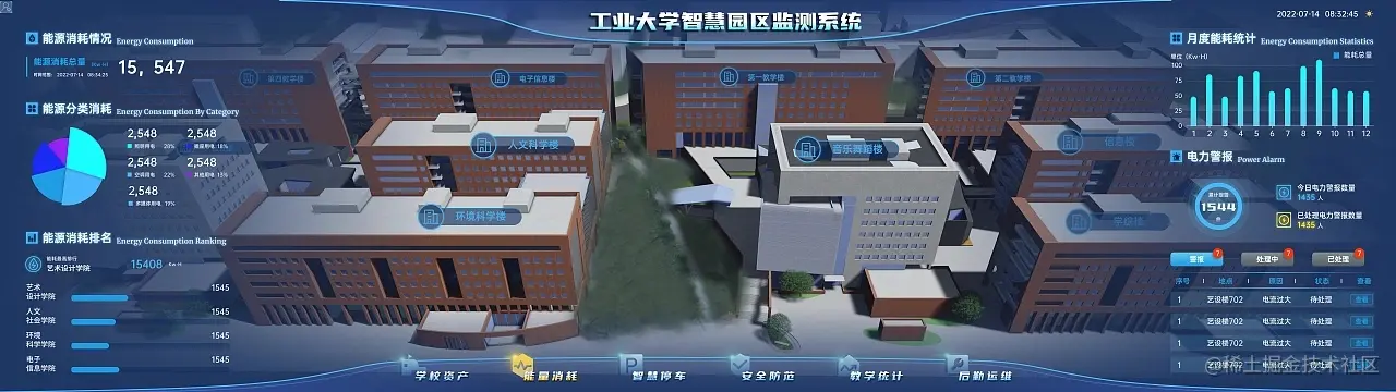 今天给大家分享一个基于 数维图 的 Sovit3D编辑器 构建的学校3D可视化场景案例——智慧学校三维可视化综合管理平台。通过对校园三维建模,多角度呈现校园建筑、设备、车辆、人流等重点管理对象的运行态势,实现学校管理综合运营态势一屏掌握。
