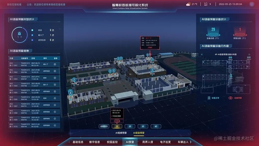 支持对校内重点楼宇的建筑外观和内部详细结构进行三维显示;并可集成视频监控、电子围栏、周界报警、门禁报警、电子巡更等监测系统数据,对楼宇重点部位、人员、告警事件等要素的实时状态进行监测,辅助校园管理者精确有力掌控重点楼宇安防态势。