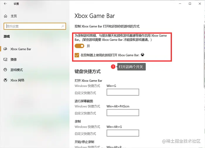 这个时候就需要使用快捷键【win+i】打开Windows设置界面,点击【游戏】选项,进入后找到右侧的Xbox Game Bar,将下图中的两个开关都给打开就可以了。