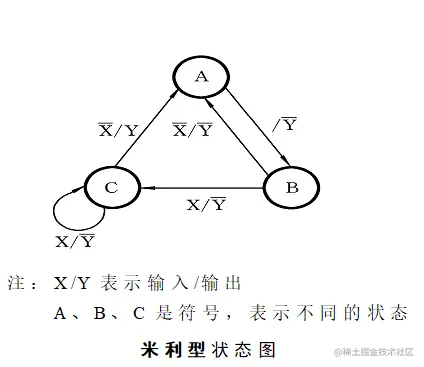 上图是米利型状态图的一个例子。在状态图中,每个状态用一个圆圈表示,圆圈内有指示状态的符号。用带箭头的方向线指示状态转换的方向,当方向线的起点和终点都在同一个圆圈上时,则表示状态不变。