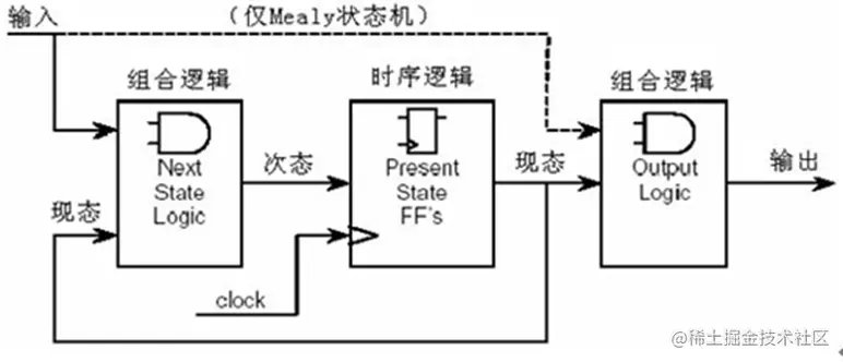 有限状态机的标准模型如图所示,它主要由三部分组成: