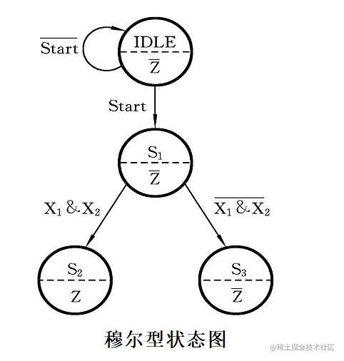 - 依据具体的设计原则,确定采用状态机类型:穆尔型状态机还是米利型状态机。