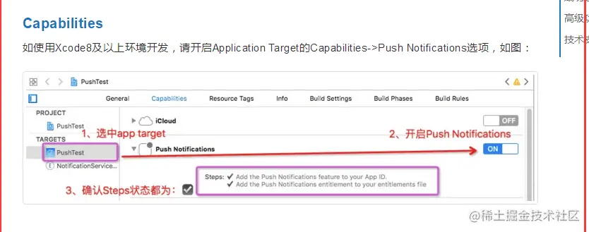 证书里需要开通 apns 功能,然后在项目里设置,如下: