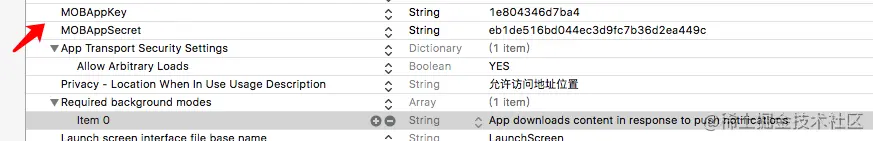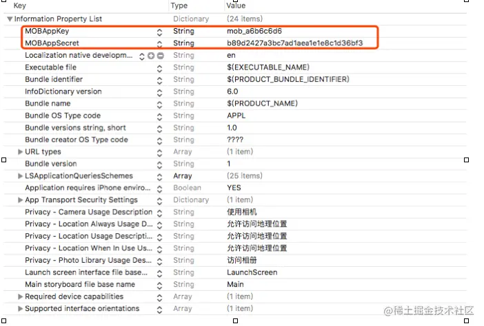 在项目的 Info.plist 中添加 2 个字段:MOBAppKey 和 MOBAppSecret,对应的值是在 mob.com 官方申请的应用的 AppKey 和 AppSecret。