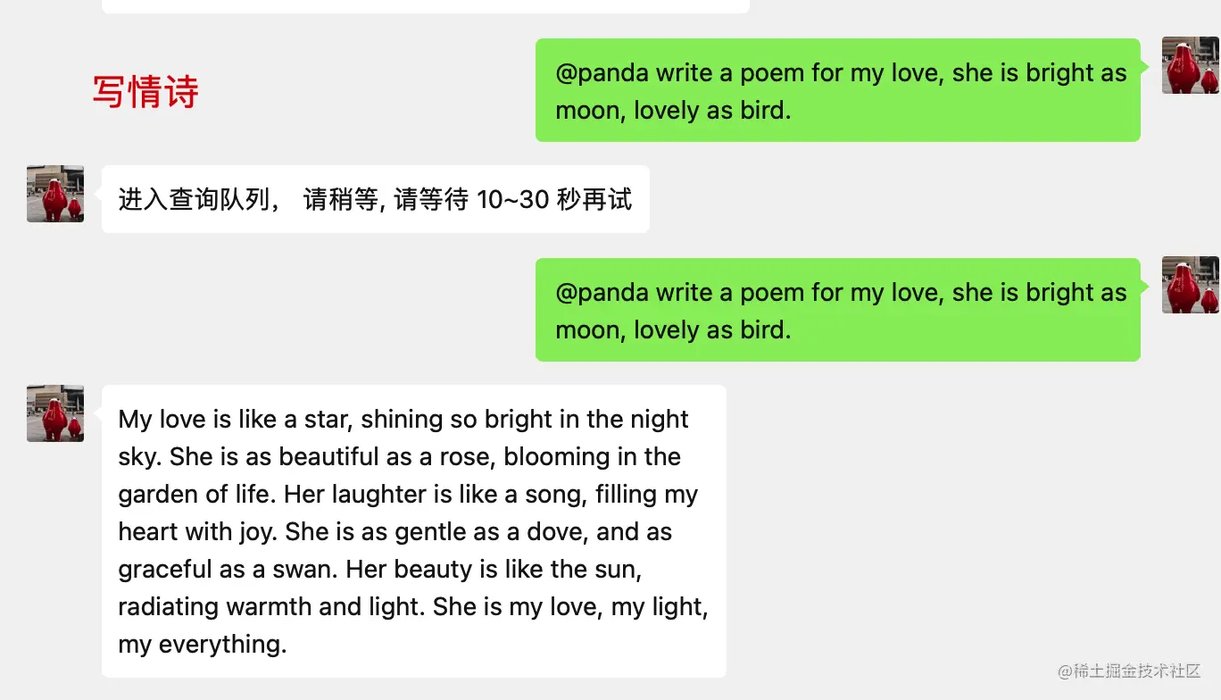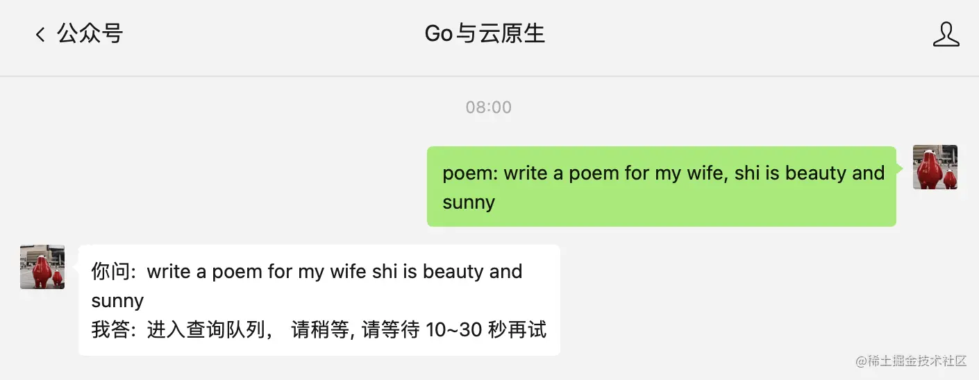 如果没有进入等待队列, 说明微信公众号接口把你的消息吃了, 需要重新打磨一下描述